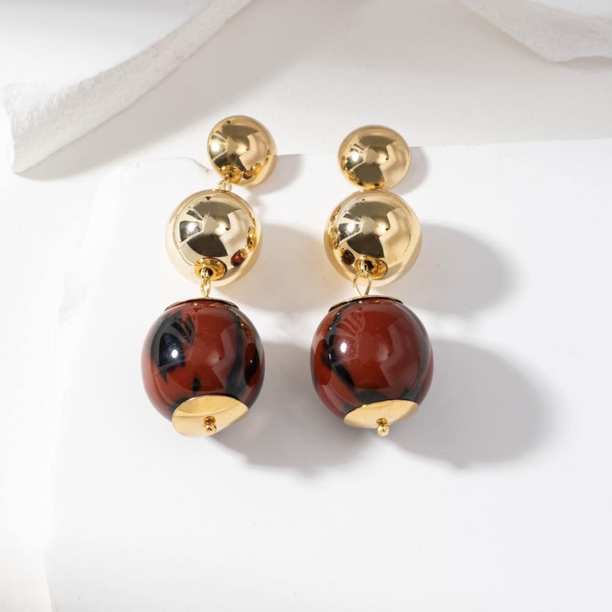 Boucles composées de trois boules, 2 en dorées et une de couleur marron/noir ou beige/marron