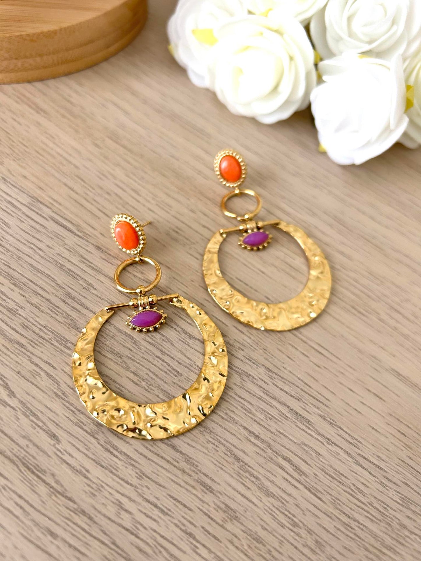 Pendant earrings in hammered golden steel with two orange and purple stones